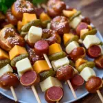 - Aufspießen: Beginnen Sie, die Laugenstücke, Mini-Kabanossi, Käsewürfel und Gewürzgurken abwechselnd auf die Holzspieße zu stecken, bis alle Zutaten verbraucht sind. Dies ergibt eine wunderbare Mischung aus Texturen und Aromen.