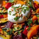 Ein eleganter Burrata-Salat mit süßem, geröstetem Gemüse und nussigen Pinienkernen, perfekt für festliche Anlässe.