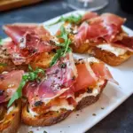 Köstliche Crostini mit cremigem Bohnenpüree und salzigem Prosciutto, perfekt für Dinnerpartys oder gemütliche Abende.