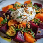A vibrant salad featuring roasted beets, sweet potatoes, carrots, and zucchini, topped with creamy burrata and toasted pine nuts.