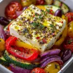 Bauernmarktgemüse, so farbenfroh und frisch, und die zarten Aromen des Fetas bieten eine köstliche Kombination aus Texturen und Geschmäckern. Das Gemüse wird beim Backen zart und saftig, während der Feta seine cremige, leicht knusprige Kruste erhält, die zum Eintauchen und Mischen einlädt. Wenn Sie das fertige Gericht aus dem Ofen holen, weht ein betörender Duft durch die Küche, der selbst die anspruchsvollsten Esser anlockt. Und wenn Sie das Gericht mit etwas frisch gebackenem Baguette servieren, um die köstliche Mischung zu genießen, werden Sie nur noch mehr in das ganze Erlebnis eintauchen wollen. Dieser gebackene Feta auf mediterranem Gemüse ist nicht nur eine Mahlzeit; es ist ein Ausdruck von Genuss und Freude am Essen.