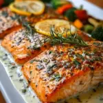 Ein festliches Abendessen mit zartem Lachs auf geröstetem Gemüse, vollendet mit einer cremigen Zitronen-Dill-Sauce.