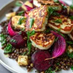 Grillierte Halloumi mit Linsen und Rote Bete feiern die Farben und Aromen der Natur! Jeder Bissen dieses prachtvollen Gerichts vereint die cremige Textur des Halloumi mit der erdigen Süße der Rote Bete und dem nussigen Geschmack von Linsen. Es ist wie ein Fest für die Sinne: der zarte Karamellgeschmack des goldbraun gegrillten Käses, die leuchtend roten Rote Bete, die beim Kauen fast zerfallen und die herzhaften Linsen, die eine wunderbar herzhafte Basis für dieses Gericht bilden.