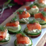 Köstliche kalte Häppchen mit Frischkäse, Lachsfilet und Gurken, ideal für jeden Anlass.