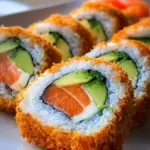 Ein köstliches Sushi-Rezept mit einer knackigen Tempura-Panade, das die Aromen von frischem Lachs, Avocado und Gurke vereint.
