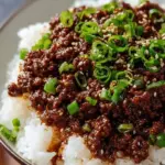 Anrichten: Servieren Sie das Rinderhackfleisch über warmem, gekochtem Reis. Garnieren Sie großzügig mit den geschnittenen Frühlingszwiebeln und eventuell anderem Gemüse.