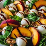 A vibrant summer salad combining juicy peaches, creamy mozzarella, arugula, and crunchy walnuts with a balsamic glaze.