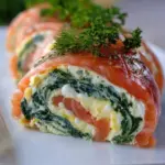 Eine köstliche Spinat-Lachs-Rolle, gefüllt mit Räucherlachs und cremigem Frischkäse, perfekt für Brunch oder ein stilvolles Abendessen.