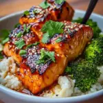 Köstliches Festmahl mit Lachs, Reis und Brokkoli, verfeinert mit einer Sriracha-Honig-Marinade.