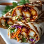 6. Servieren: Schneiden Sie die Wraps schräg in der Mitte durch und genießen Sie sie am besten sofort, damit die Texturen und Aromen frisch sind.
