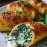 Delicious vegan potato pockets filled with creamy spinach and vegan cream cheese, perfect as a snack or meal.