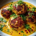 Eine köstliche Kombination aus knusprigen Linsenknödeln in einer cremigen Curry-Sauce – ideal für vegane Genießer.
